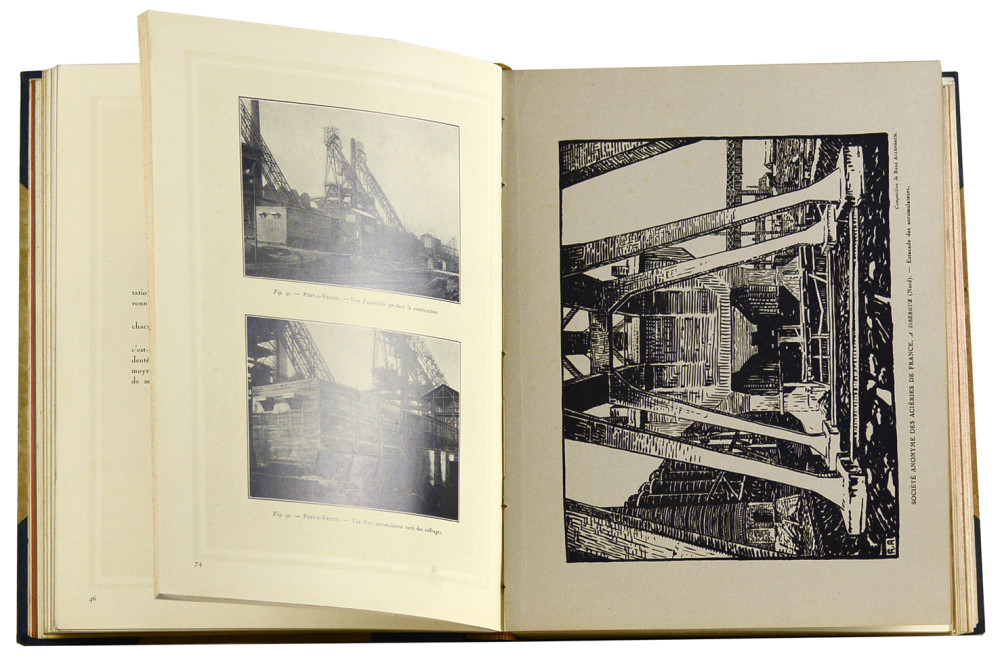 Intéressant volume donnant un aperçu des nombreuses exécutions des 25 premières années d'existence de la Société Anonyme des anciens établissements ED. Zublin & Cie, fondée à Naples en 1885 par Edouard Zublin, puis transférée à Strasbourg en 1898. L'album est divisé 6 albums distinct : I. Travaux hydrauliques. II. Silos et accumulateurs. III. Travaux de terrassements, tunnels, fondations, pieux et palplanches, travaux de ports, murs de quai, murs de soutènement, ponts et viaducs. IV. Usines. V. Architecture. VI. Trappes d'accumulateurs. Manutention mécanique appliquée à la métallurgie. Luxueusement imprimé, l'album est illustré de nombreuses reproductions photographiques, et de nombreuses compositions hors-texte de René Allenbach. Bel exemplaire.
