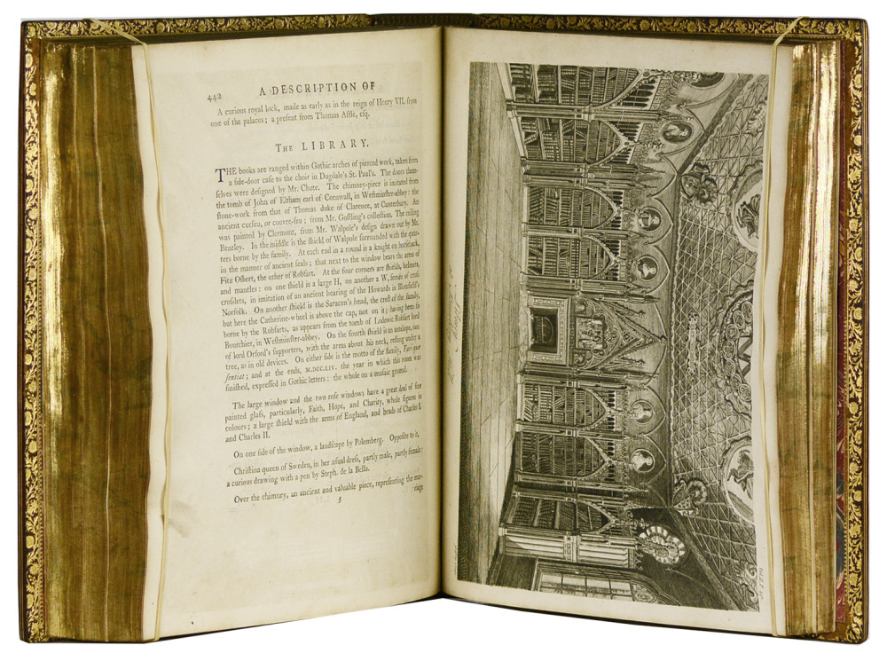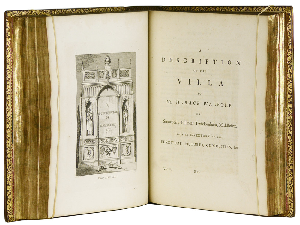 Édition collective en cinq volumes des œuvres de l’écrivain, historien, antiquaire et homme politique Horace Walpole (1717-1797), fils du premier ministre Robert Walpole et figure marquante du XVIII? siècle anglais. Elle réunit l’ensemble de ses écrits majeurs, publiés peu après sa mort, parmi lesquels : Anecdotes of Painting in England, The Castle of Otranto (le roman gothique fondateur du genre), Catalogue of Royal and Noble Authors, Historic Doubts on the Life and Reign of King Richard the Third, ainsi que sa correspondance, ses essais critiques, mémoires et notices biographiques. Cette édition, soigneusement imprimée sur papier vergé, constitue la première réunion complète des œuvres de Walpole, réalisée sous la supervision de Mary Berry, amie proche et légataire littéraire de l’auteur. Elle est illustrée de 176 planches gravées hors-texte, dont 11 dépliantes. Le Château d'Otrante, et la description de la fantastique villa de Walpole, Strawberry-Hill, et des collections qu'elle renfermait, occupent le tome II. Rousseurs éparses et petites brunissures du papier, mais très bel exemplaire, présenté dans une reliure de l'époque qui, malgré les minimes défauts signalés, reste d'une fraîcheur remarquable.