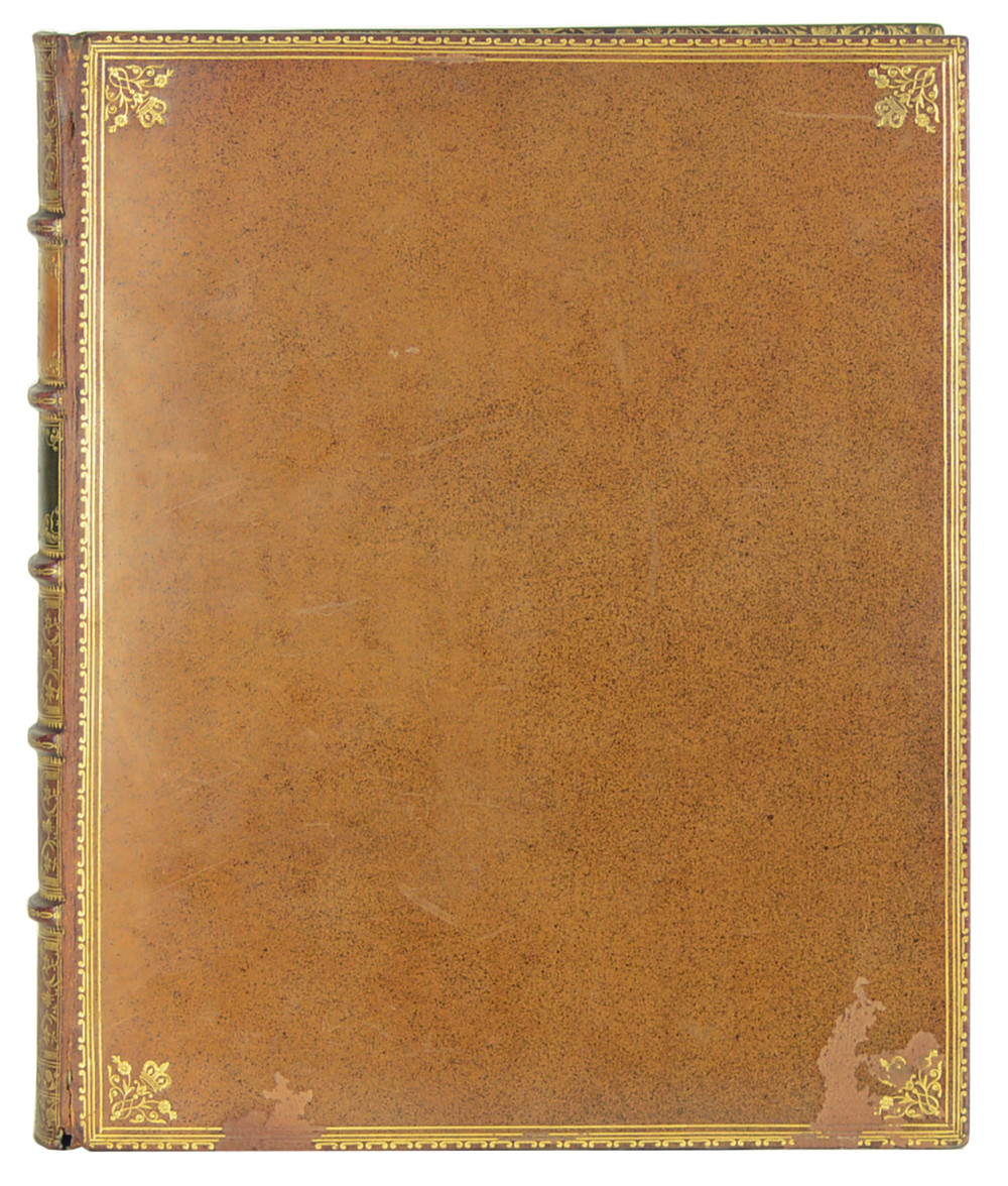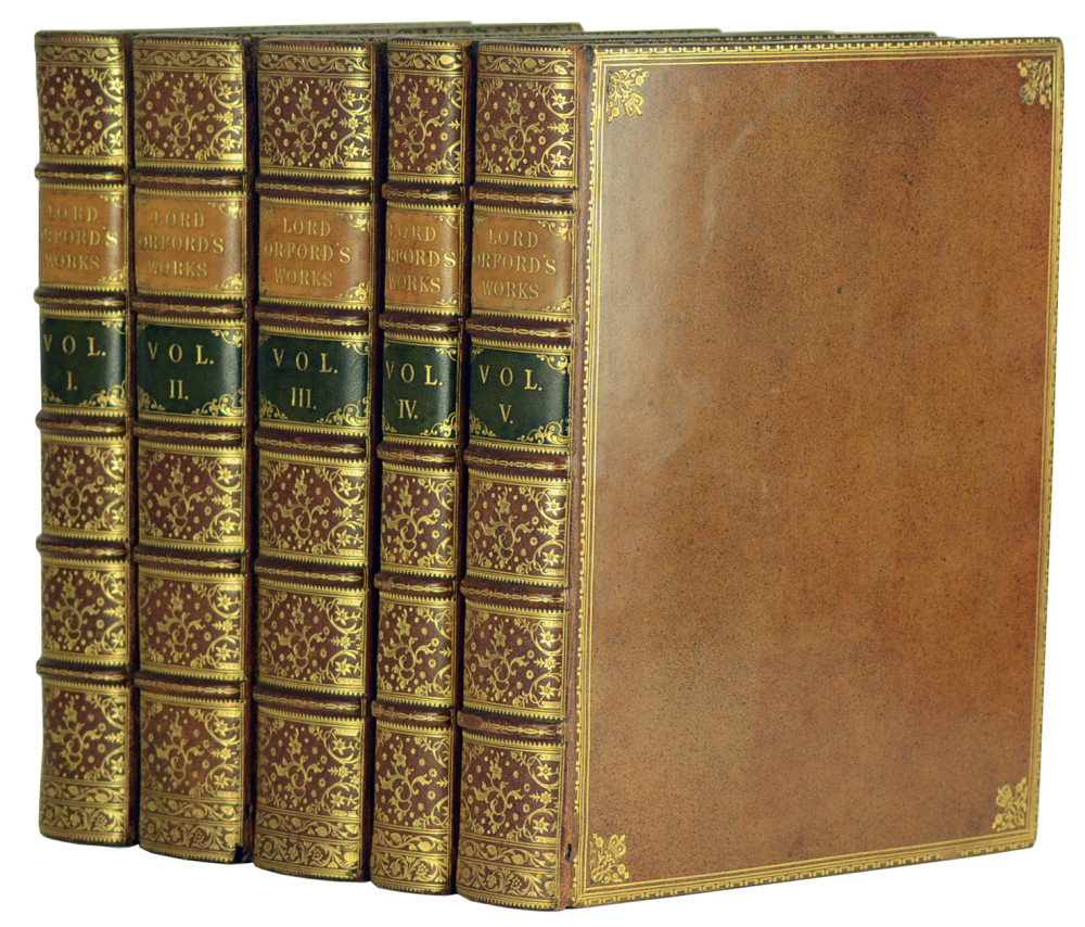 Londres, Printed for G.G. and J. Robinson, and J. Edwards, 1798 ; 5 volumes grand in-4 (29,7 x 24,7 cm), XXIV + 577 + 576 + VII + 512 + VII + 468 + VI + 675 pp., plein veau moucheté glacé de l'époque, dos richement orné à nerfs, pièces de titre ("Lord Orford's Works") havanes, pièces de tomaison vertes, triple filets et roulettes d'encadrement sur les plats avec, aux quatre coins, des couronnes royales surmontant des fleurons d'angles, double filets sur les coupes, dentelle intérieure, tranches dorées sur marbrure (minimes et superficielles épidermures éparses, infimes manques de cuir à l'un ou l'autre mors ou encoche de coiffe). Les 5 volumes.