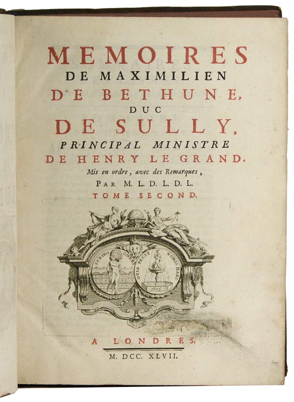 Brunet, V, 588. Seconde édition des Mémoires de Sully donnée par l'abbé de L'Écluse des Loges. Elle est illustrée d'un frontispice de Licherie gravé par Baudet et de 3 grandes vignettes de titre dessinées par Gravelot et gravées par Fessard. Mouillures aux deux premiers feuillets du 3e volume, des rousseurs éparses, mais l'exemplaire reste correct. En l'état.
