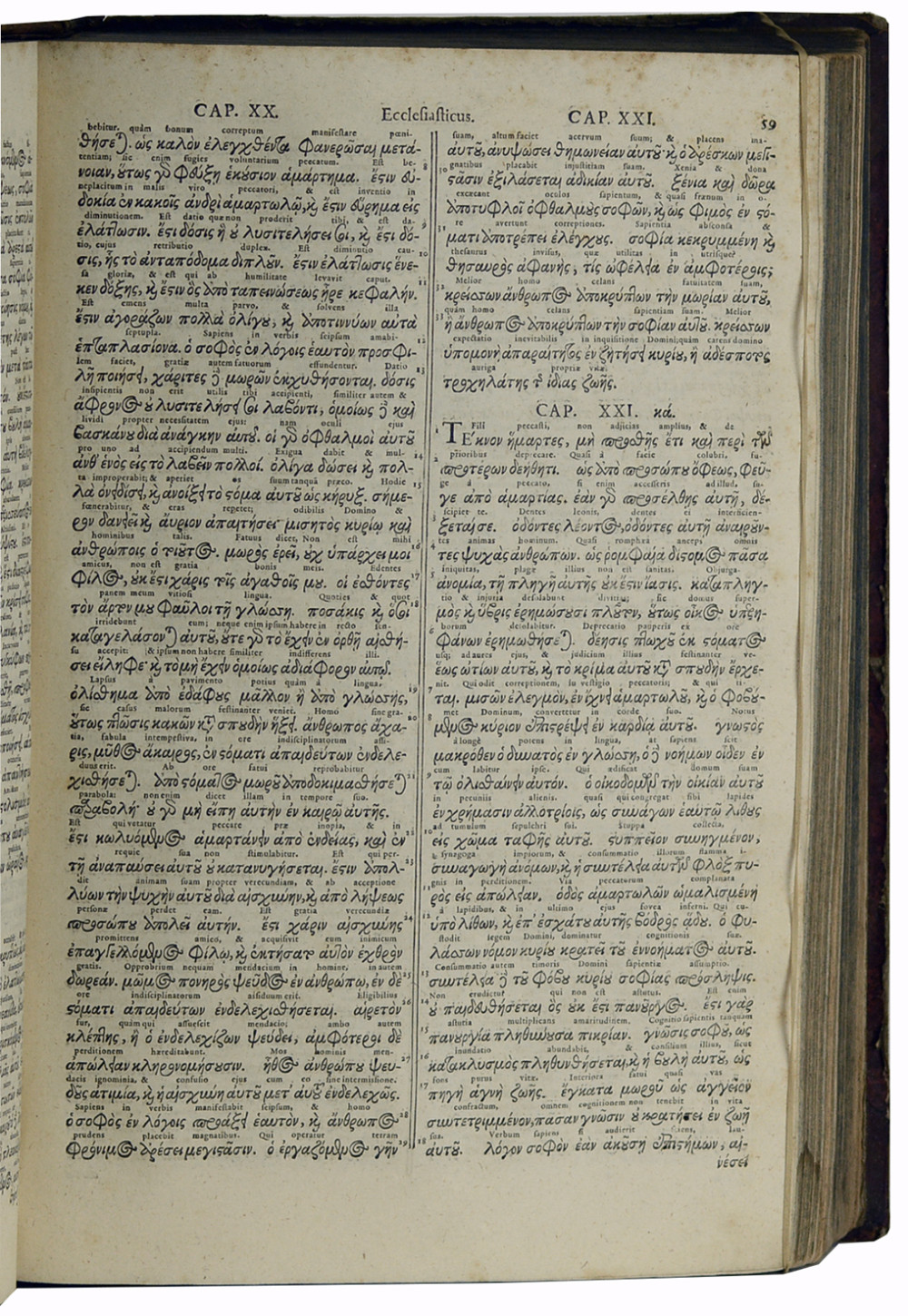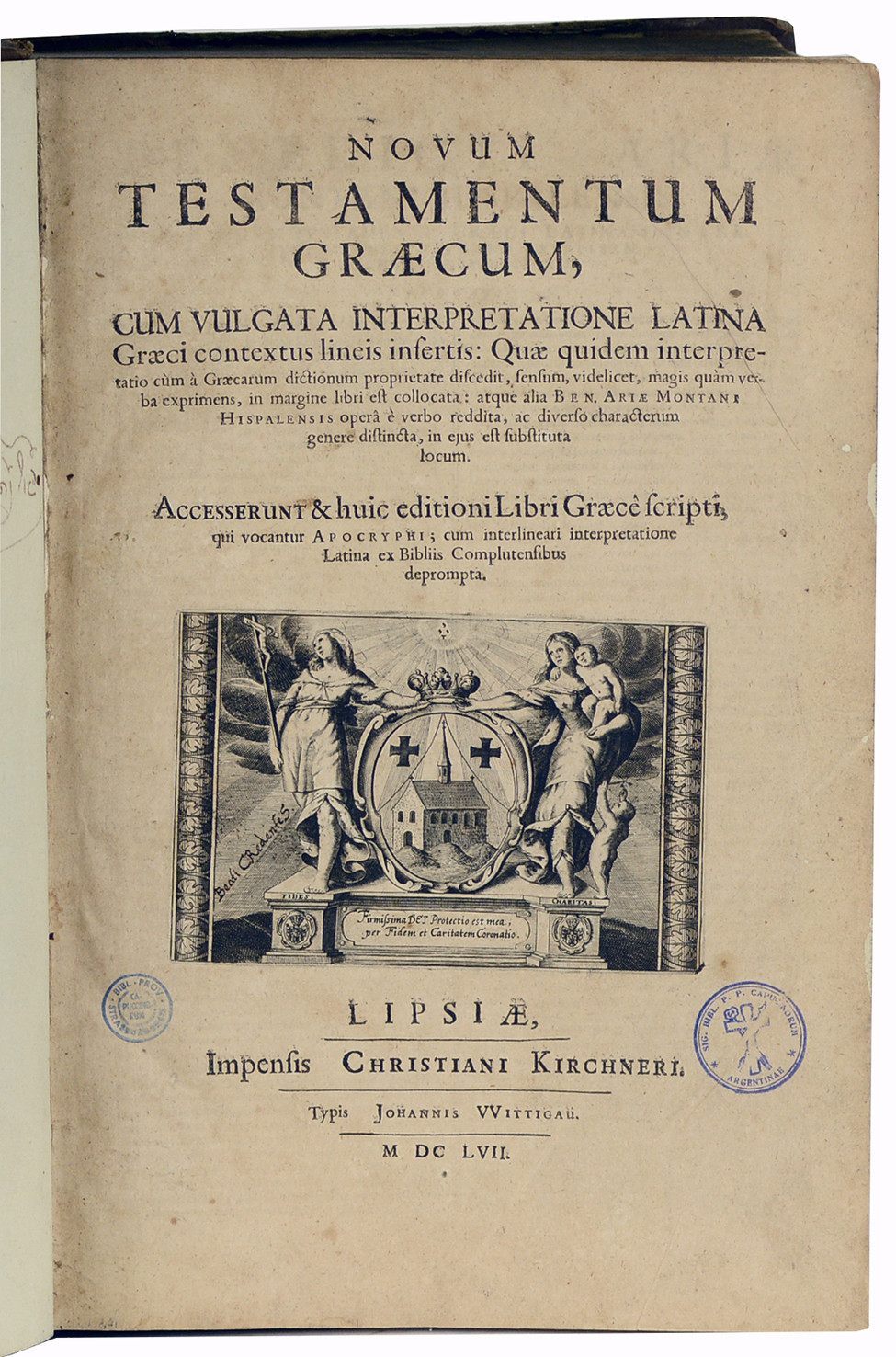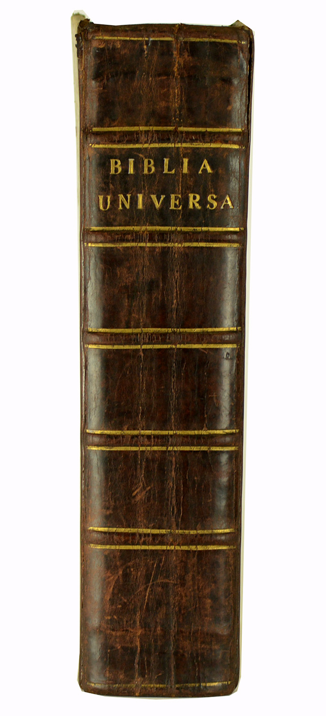 Intéressante bible polyglotte, imprimée en hébreu, grec et latin, contenant l'Ancien Testament hébreu en regard du texte latin de Santes Pagninus (1470-1536), ainsi que le Nouveau Testament grec en regard du texte latin de la Vulgate, tous deux collationnés et édités par B. Arias Montanus (1527-1598) pour la Polyglotte de Plantin. Vient ensuite la « Bibliorum pars quae Hebraice non invenitur », la version grecque (Septante) des livres qui ne figurent pas dans la Bible hébraïque (Tanakh). Vignette de titre gravée pour la partie grecque (page de titre restaurée comportant deux cachets d'une bibliothèque conventuelle ; titre entièrement gravé pour la partie hébraïque. Papier parfois bruni ou comportant des rousseurs, mais exemplaire correct, complet. En l'état.