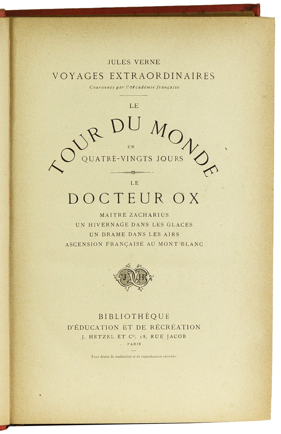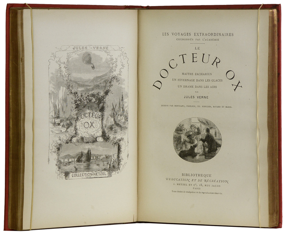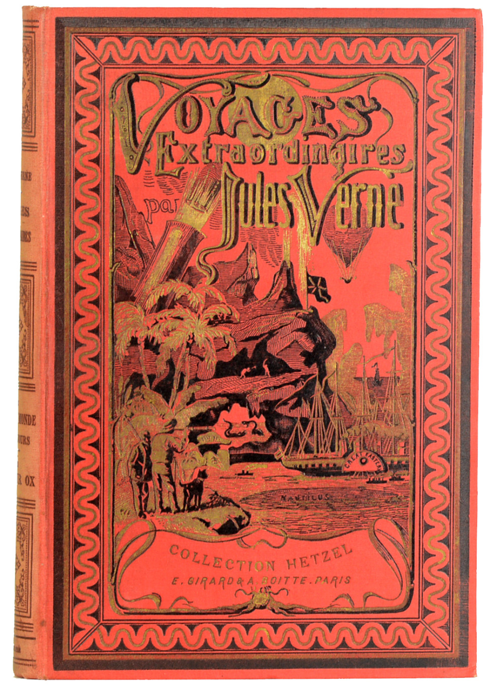 Paris, J.Hetzel et Cie, Bibliothèque d'éducation et de récréation, s.d. (vers 1886) ; in-4, 220 + 211 pp., cartonnage rouge de l'éditeur, décor "à l'obus" sur le plat supérieur, tranches dorées (le dos et une bande de deux cm, le long de la charnière du plat inférieur, sont insolés).