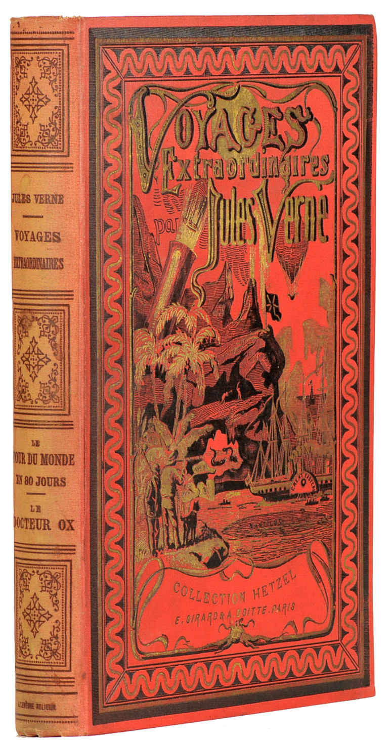 Cartonnage d'éditeur dit "A l'obus", rouge, signé Lenègre au dos et au bas du plat inférieur. Hetzel a soldé, vers 1886, une partie de ses stocks de feuilles imprimées, correspondant à trois titres, aux imprimeurs Girard et Boitte avec lesquels il avait déjà travaillé. Ors du plat supérieur un peu ternis, bon exemplaire malgré le dos insolé, sans rousseur.