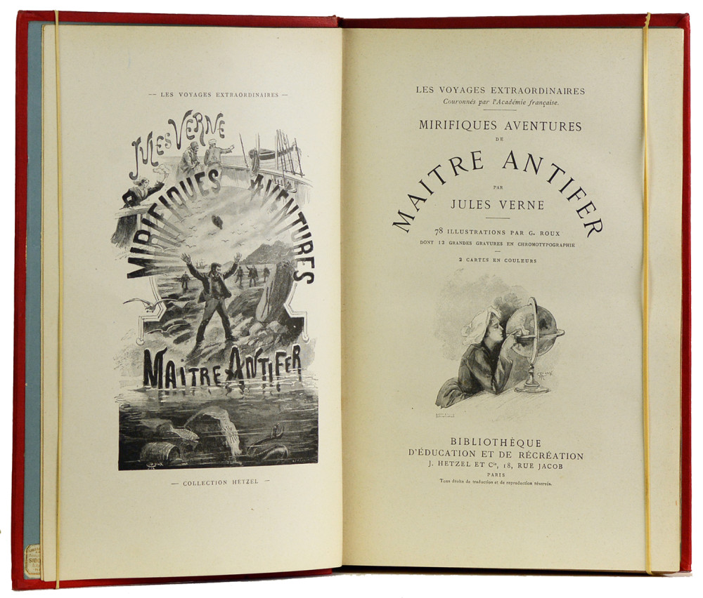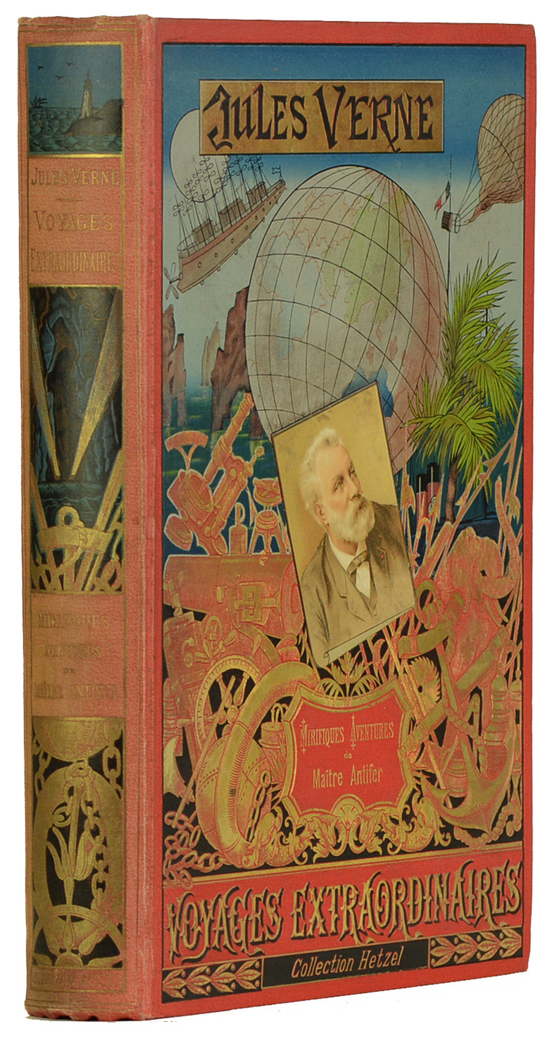 Paris, J.Hetzel et Cie, Bibliothèque d'éducation et de récréation, (1894) ; in-4, 420 pp. + 4 ff. de catalogue, Cartonnage éditeur Hetzel "au portrait collé" en pleine percaline rouge signé A. Lenègre, premier plat polychrome signé Souze représentant divers moyens de locomotion (ballon, locomotive, bateaux), un portrait de l'auteur dans les tons sépias contrecollé au centre, divers instruments de navigation rehaussés à l'or au premier plan, second plat de type "e" comme indiqué par Jauzac, dos orné de plusieurs illustrations en couleur et à l'or, pages de garde bleues d'origines (dos insolé).