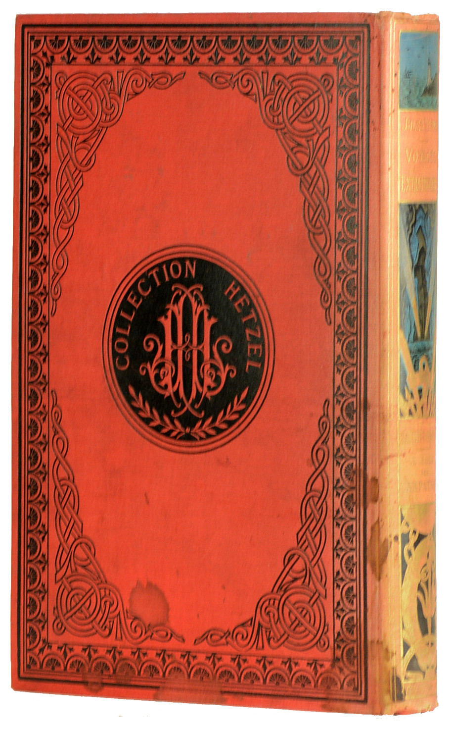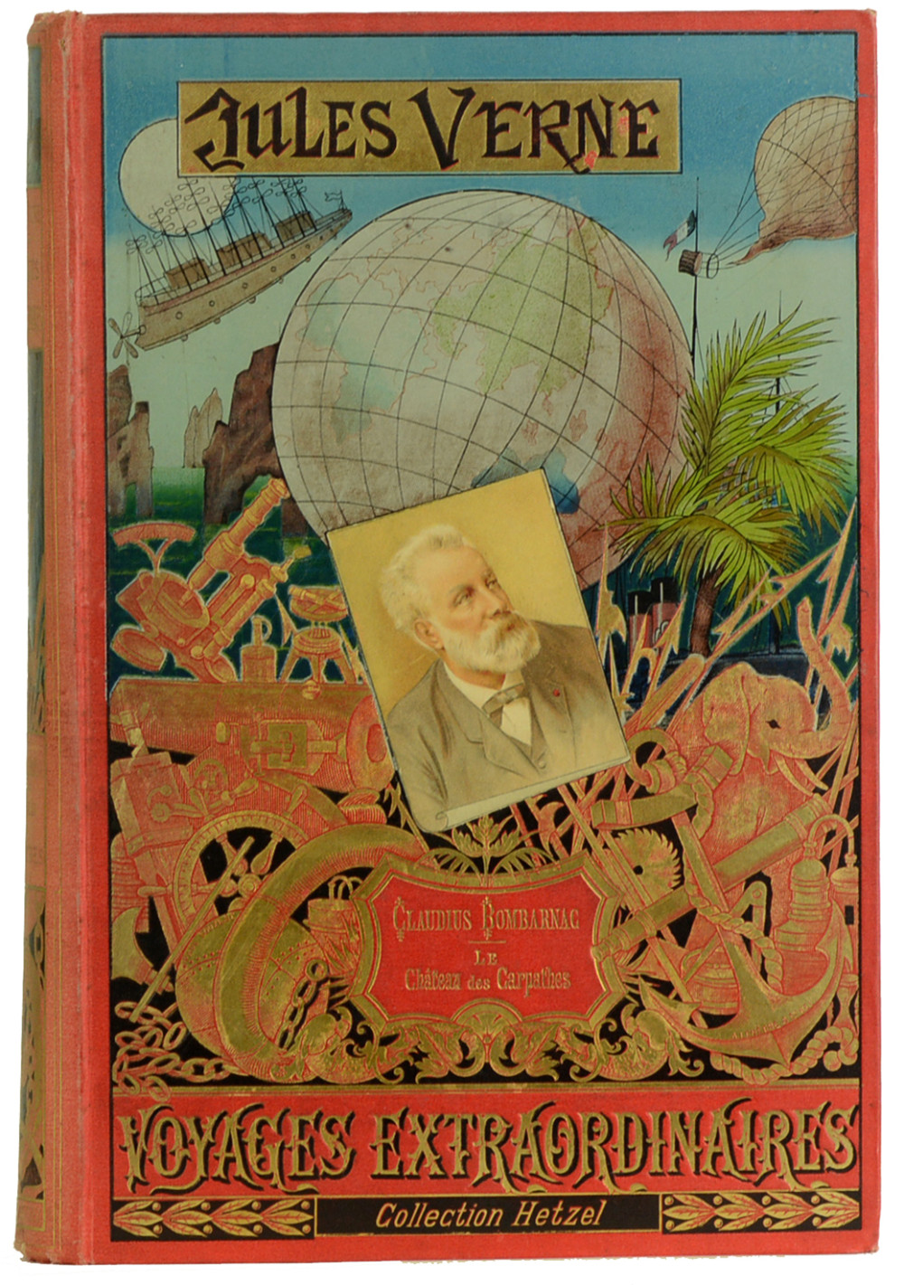 Paris, J.Hetzel et Cie, Bibliothèque d'éducation et de récréation, (1892) ; in-4, 285 + 199 pp. + 4 ff.n.ch., Cartonnage éditeur Hetzel "au portrait collé" en pleine percaline rouge signé A. Lenègre, premier plat polychrome signé Souze représentant divers moyens de locomotion (ballon, locomotive, bateaux), un portrait de l'auteur dans les tons sépias contrecollé au centre, divers instruments de navigation rehaussés à l'or au premier plan, second plat de type "e" comme indiqué par Jauzac, dos orné de plusieurs illustrations en couleur et à l'or, pages de garde bleues d'origines (dos insolé, quelques taches au second plat).