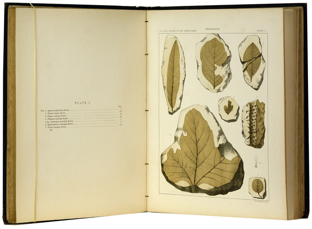 Édition originale de cette monographie de référence sur les flores fossiles disparues d’Amérique du Nord (du Crétacé supérieur au Tertiaire). L’ouvrage propose des descriptions détaillées de plantes fossiles, accompagnées de 68 planches lithographiées. Bon exemplaire.