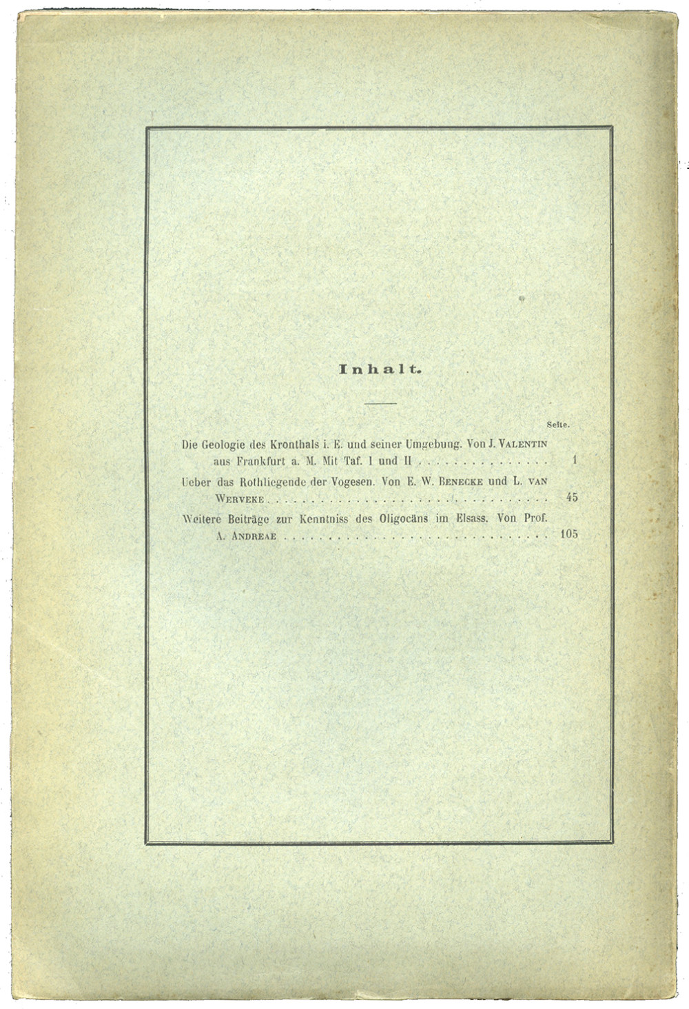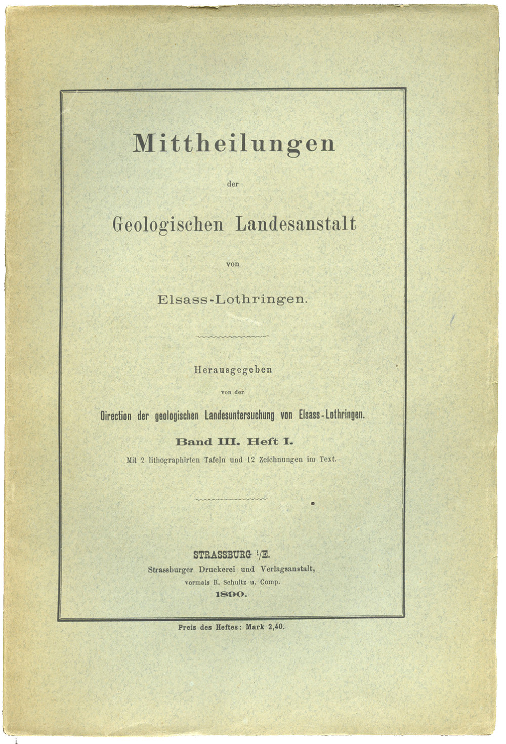 Publication de l’Institut géologique d’Alsace-Lorraine, organe scientifique majeur pour l’étude du territoire durant la période allemande. Ce cahier réunit plusieurs contributions : Die Geologie des Kronthals i. E. und seiner Umgebung [La géologie du Kronthal en Alsace et de ses environs], par J. Valentin ; Ueber das Rothliegende der Vogesen [Sur le Rothliegend des Vosges], par E. W. Benecke et L. van Werveke ; Weitere Beiträge zur Kenntniss des Oligocäns im Elsass [Nouvelles contributions à la connaissance de l’Oligocène en Alsace], par le professeur A. Andreae. Bon exemplaire, complet des 2 planches lithographiques dépliantes en couleurs.