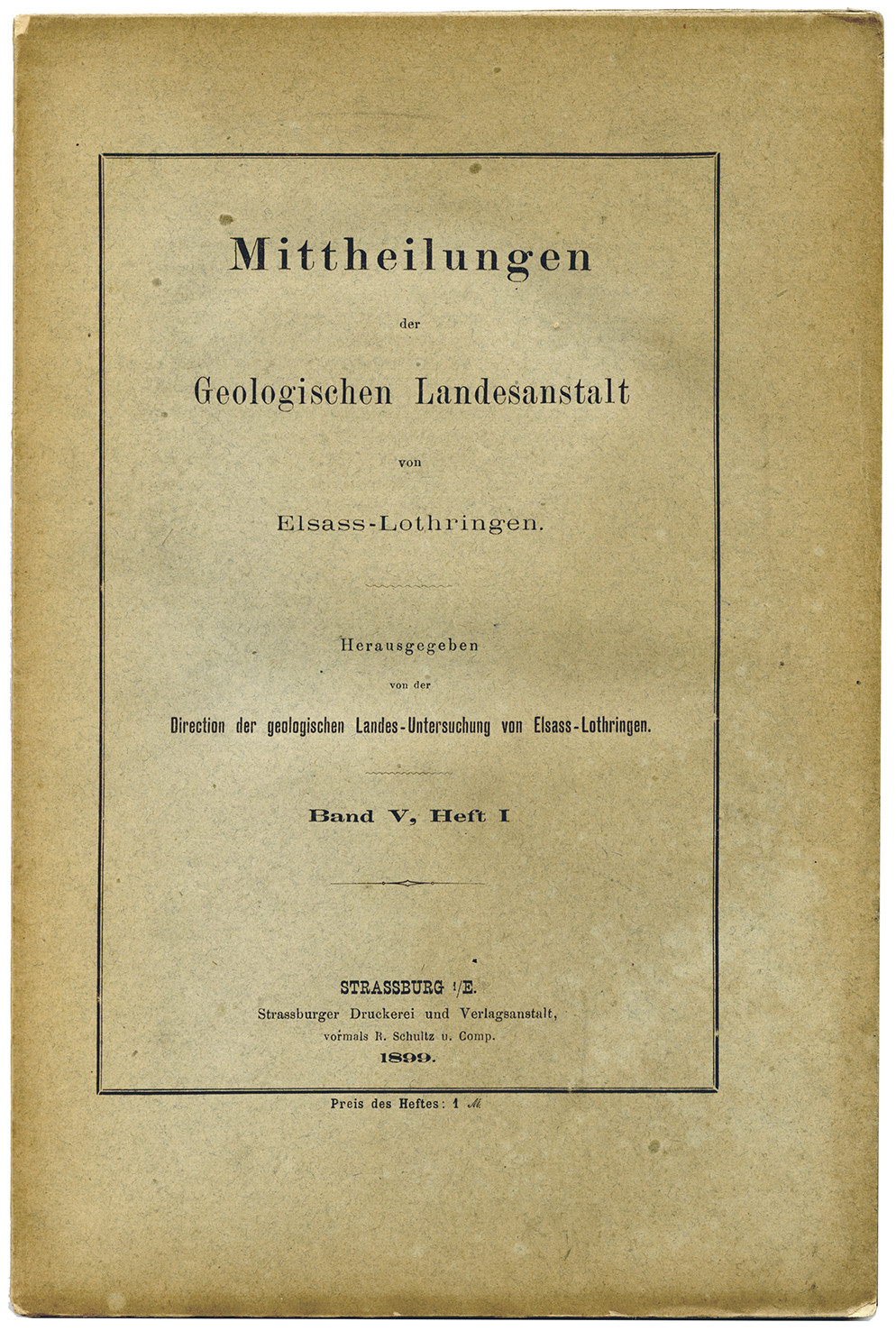 Publication de l’Institut géologique d’Alsace-Lorraine, organe scientifique majeur pour l’étude du territoire durant la période allemande. Ce cahier s’ouvre sur le rapport annuel de la direction (Bericht der Direction der geologischen Landes-Untersuchung von Elsass-Lothringen für das Jahr 1898 [Rapport de la direction de l’enquête géologique d’Alsace-Lorraine pour l’année 1898]), suivi de plusieurs contributions consacrées à la géologie régionale : Mittheilungen über das Gneiss- und Granitgebiet nördlich von Markirch [Études sur les terrains de gneiss et de granite au nord de Sainte-Marie-aux-Mines], par W. Bruhns ; Ueber die Gestalt und den geologischen Aufbau der unterelsässischen Rheinebene [Sur la forme et la structure géologique de la plaine rhénane de Basse-Alsace], par le Dr E. Schumacher ; Jüngerer Löss auf der Niederterrasse [Lœss récent sur la terrasse inférieure], par B. Förster.