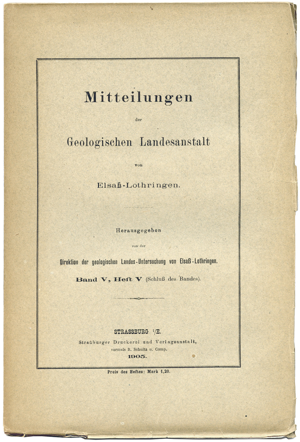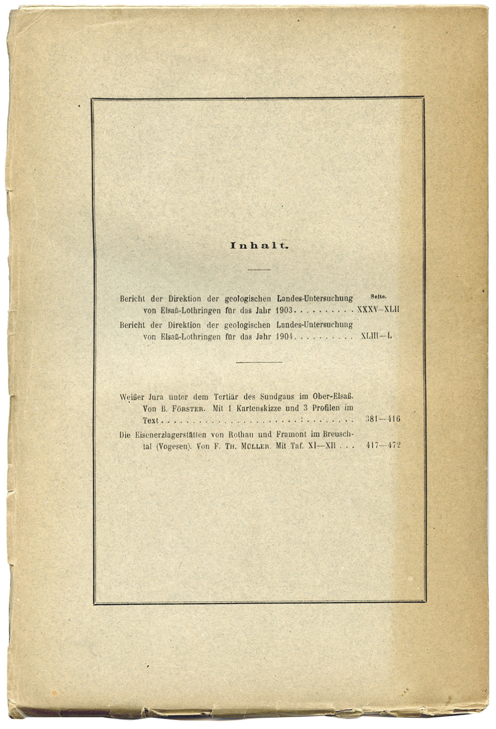 Publication de l’Institut géologique d’Alsace-Lorraine. Ce cahier s’ouvre sur les rapports annuels (Bericht der Direction der geologischen Landes-Untersuchung von Elsass-Lothringen für das Jahr 1903 [Rapport de la direction de l’enquête géologique d’Alsace-Lorraine pour l’année 1903] ; … für das Jahr 1904 [Rapport … pour l’année 1904]), suivis de deux contributions : Weisser Jura unter dem Tertiär des Sundgaus im Ober-Elsass [Le Jurassique blanc sous le Tertiaire du Sundgau en Haute-Alsace], par B. Förster ; Die Eisenerzlagerstätten von Rothau und Framont im Breuschthal (Vogesen) [Les gisements de minerai de fer de Rothau et Framont dans la vallée de la Bruche (Vosges)], par F. Th. Müller. Bien complet des planches XI (en couleurs) et XII.