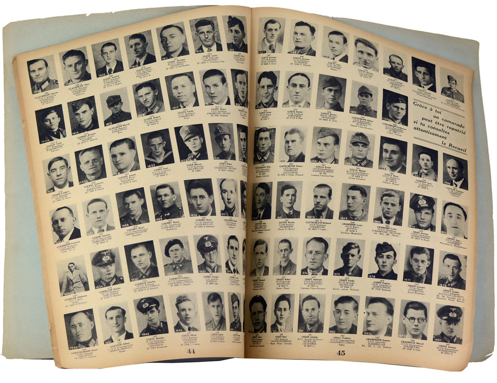 Édition originale préfacée par François Mitterrand, alors ministre des anciens combattants et victimes de guerre. Les deux fascicules, très largement diffusés à l'époque de leur parution, présentent plus de 6000 portraits photographiques de "non rentrés". Ils devaient permettre d'identifier les près de 10000 disparus du Bas-Rhin, et mettre fin au tourment et à l'incertitude des familles. Bons exemplaires.