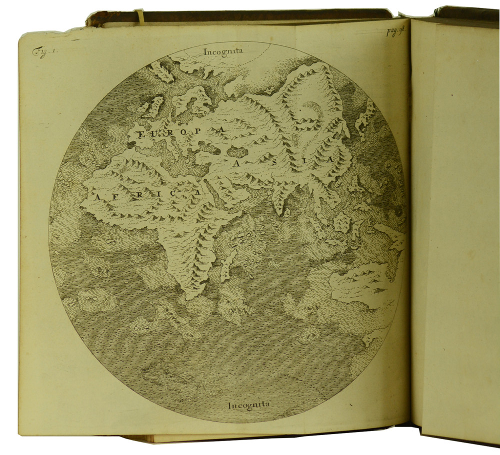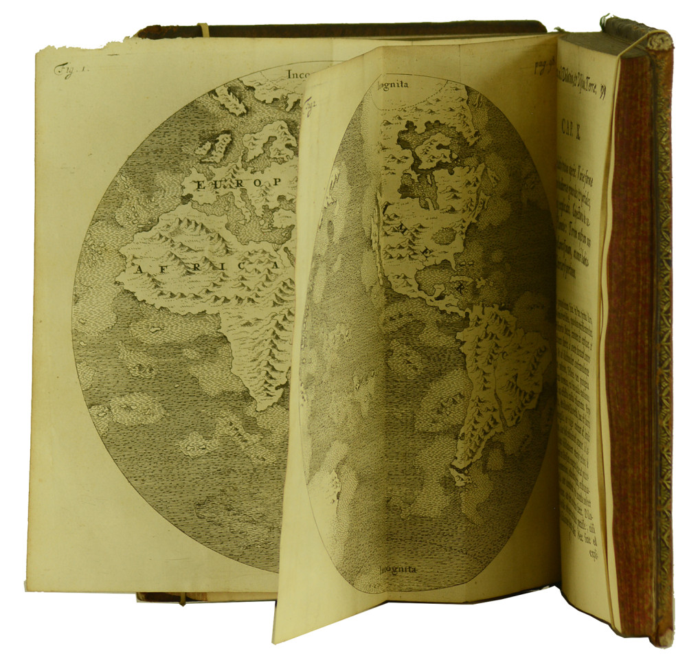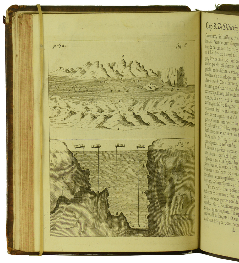 Première édition des deux premières parties (les troisième et quatrième parties parurent en 1689) de cette Théorie sacrée de la Terre de l'écrivain et théologien anglais Thomas Burnet (1635-1715). Adaptant sa théorie sur celle de Descartes, Burnet propose un exposé historique du passé de la Terre en réunissant, comme le titre le laisse entendre, la physique cartésienne et l'Histoire Sainte. La première partie est illustrée de 10 planches finement gravées sur cuivre, et de deux planches dépliantes. La seconde partie est illustrée de deux planches gravées. Exemplaire correct malgré les défauts signalés, et des cachets de bibliothèque sur les pages de titre et de garde.