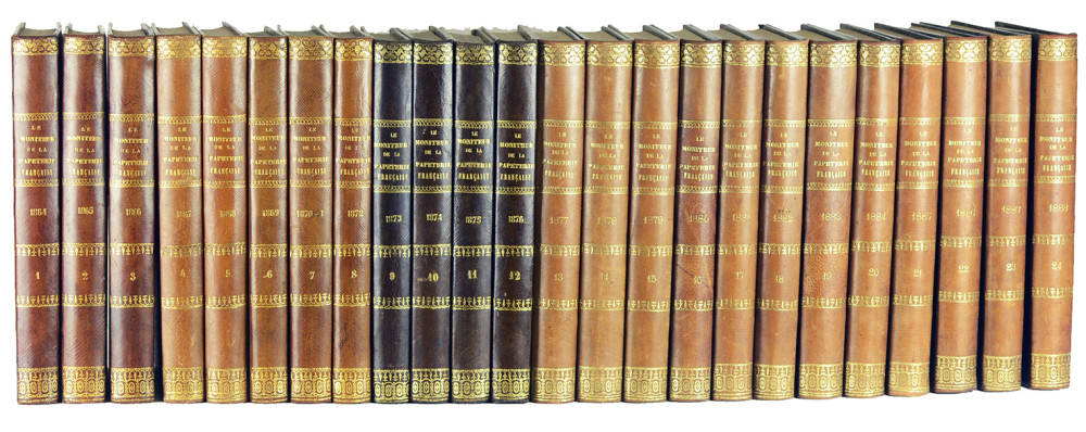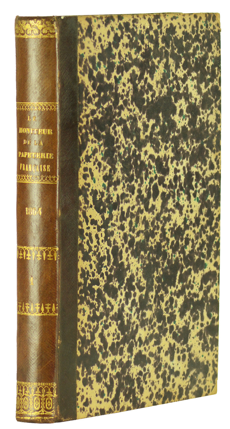 Rare tête de collection de cette revue dédiée à tout ce qui concernait l'industrie du papier en France : actes officiels, inventions nouvelles, questions de douanes, traités de commerce, tarifs de transports par eau et par chemin de fer, lois ou projets de lois, etc. La publication de cet importante documentation avait été décidée à la suite du Congrès des Fabricants de papier de 1864 ; elle s'étendra jusqu'en 1940. Nombreuses planches techniques, souvent dépliantes, in et hors-texte. Bel exemplaire, constituant une source documentaire essentielle pour cette période.
